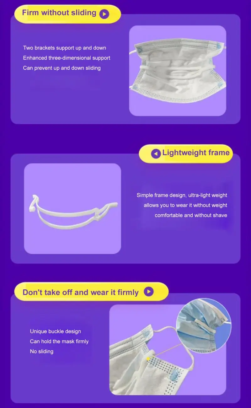 Разработанный в соответствии с изгибом человеческого лица, он имеет более сильную посадку, а боковой крючок можно надежно повесить на ушную веревку маски, поэтому он не беспокоится о скольжении.