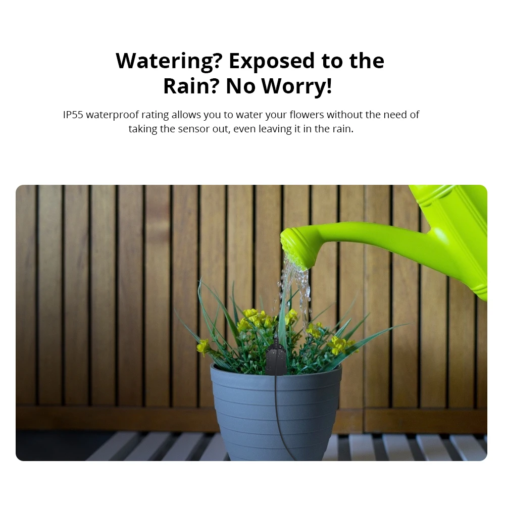 Водонепроницаемость IP55 позволяет поливать ваши цветы без необходимости извлекать датчик, даже оставляя его под дождем.