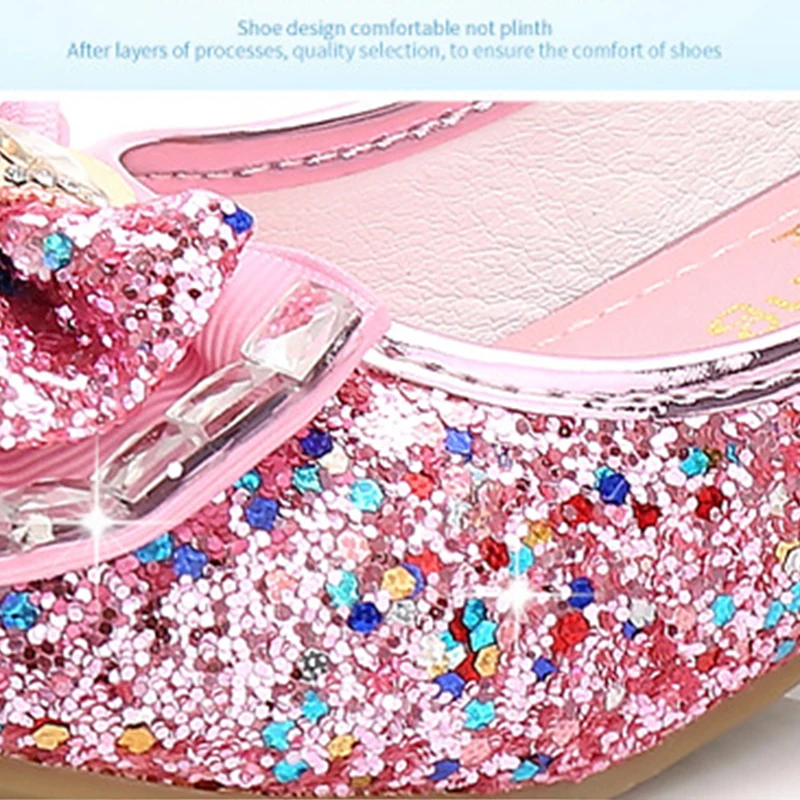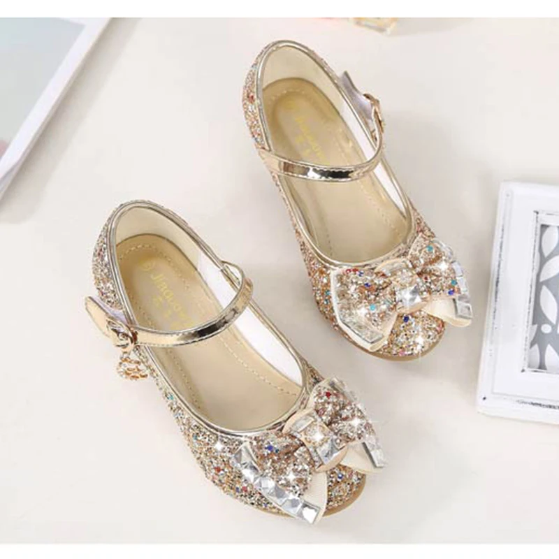 Детские туфли для танцев, кожаные туфли на высоком каблуке для девочек, дышащие туфли с блестками и бантом