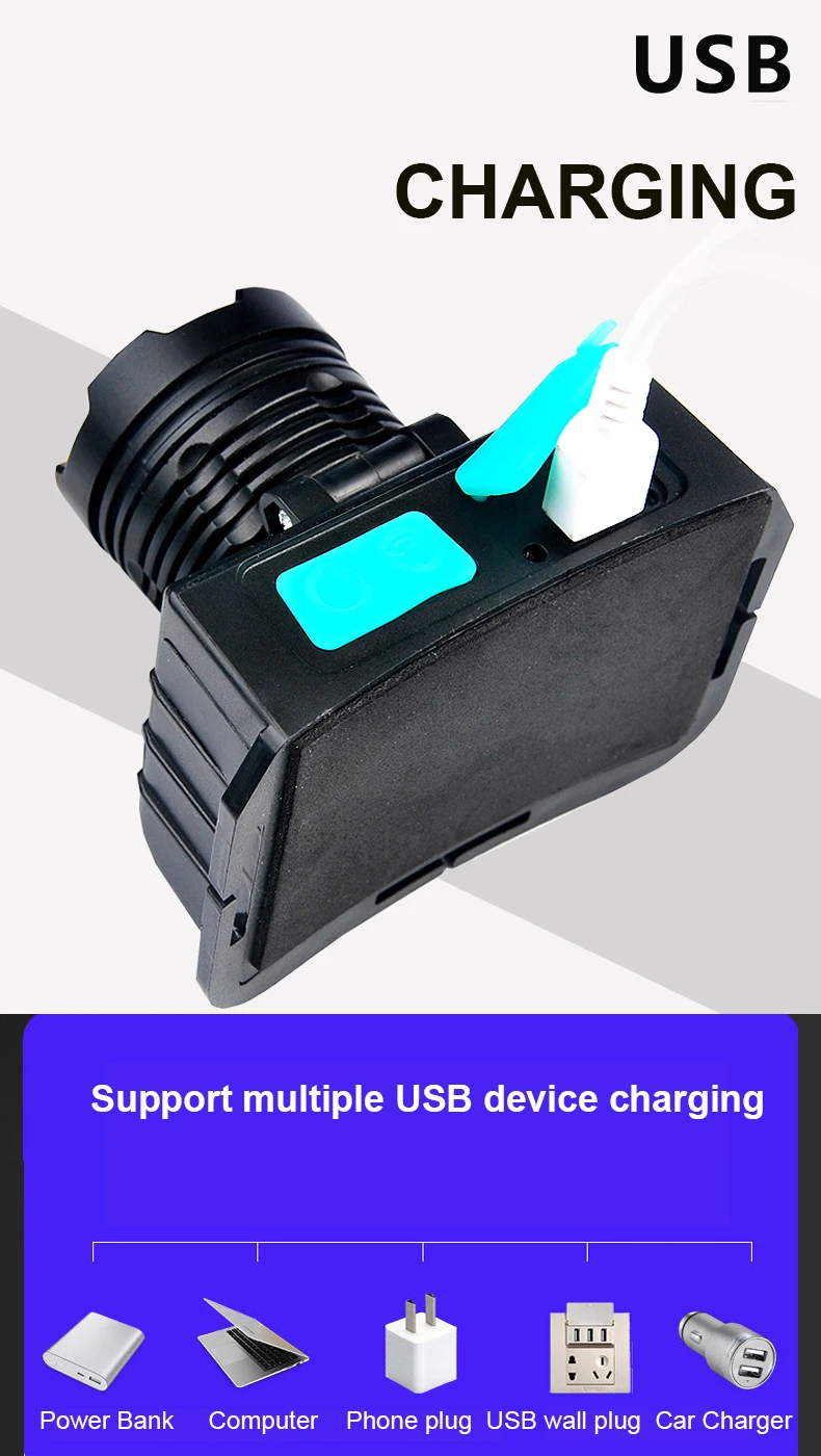 Функция:Портативное Наружное освещение имеет полный перспективный дизайн, а usb-порт для зарядки увеличивает мощность. Основной светодиодный светильник. Специальный двойной переключатель гарантирует Переключение режима преобразования. Высокоемкие аккумуляторные батареи обеспечивают прочную мощность для более безопасных видов спорта на открытом воздухе. Фары в основном используются для рыбалки, охоты, ночного бега, походов и кемпинга.