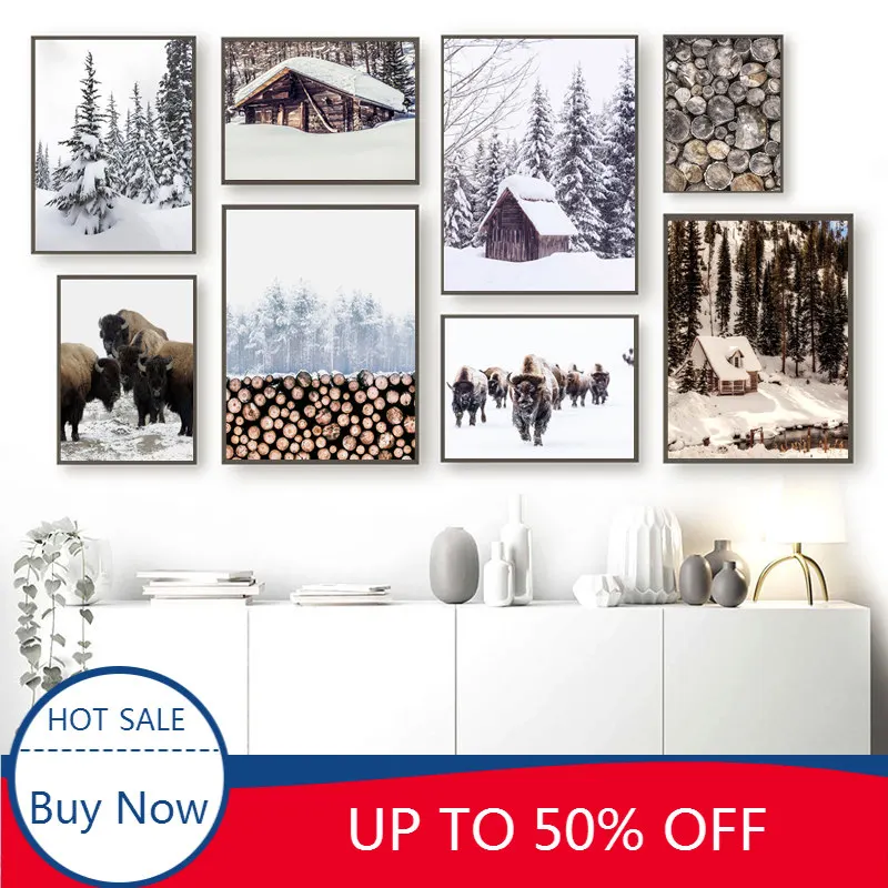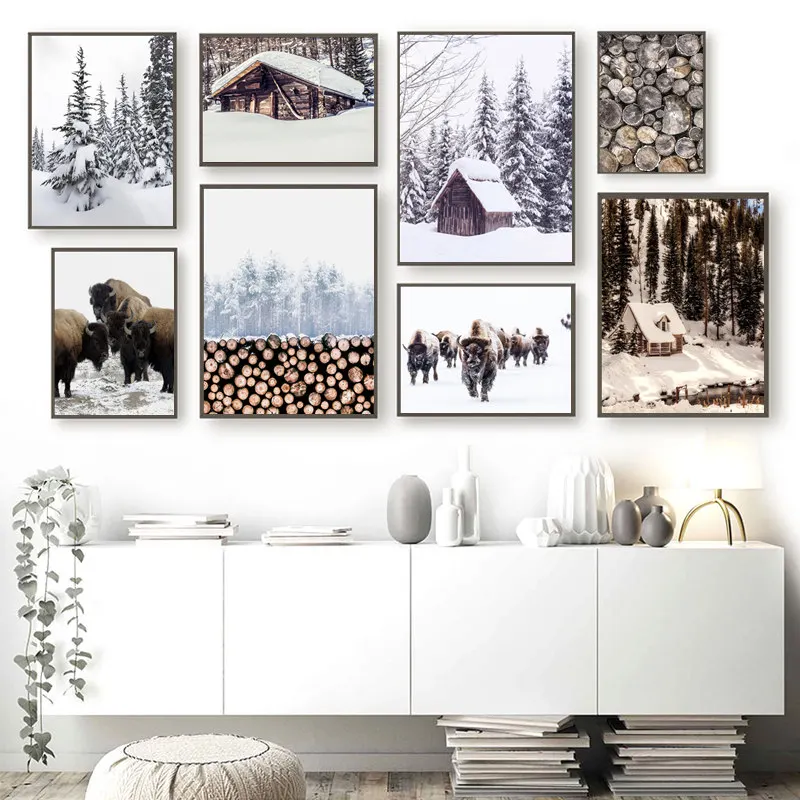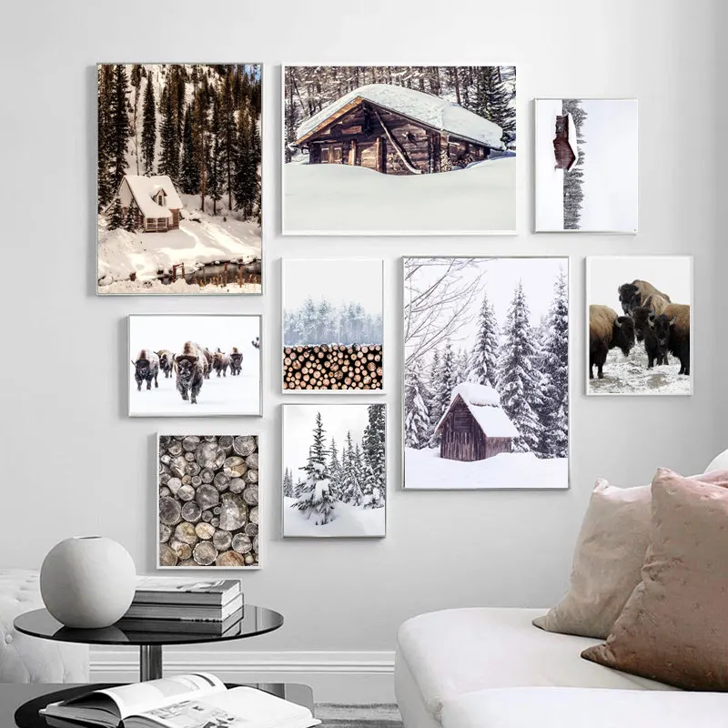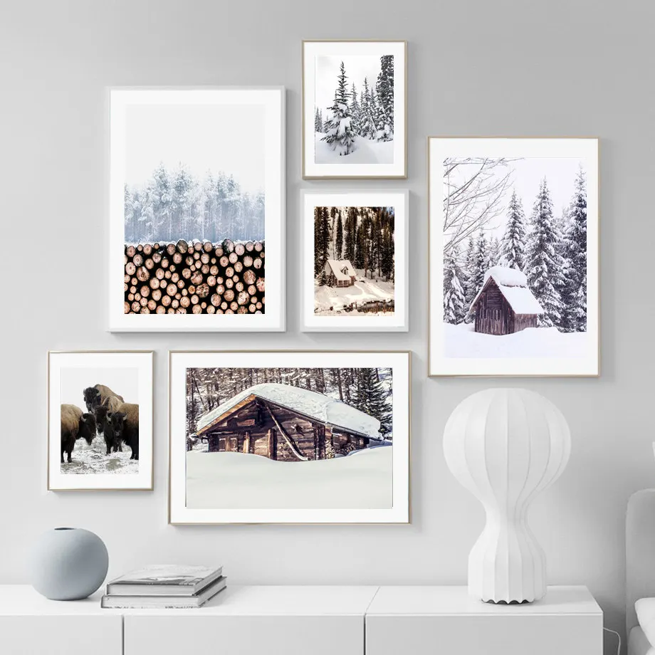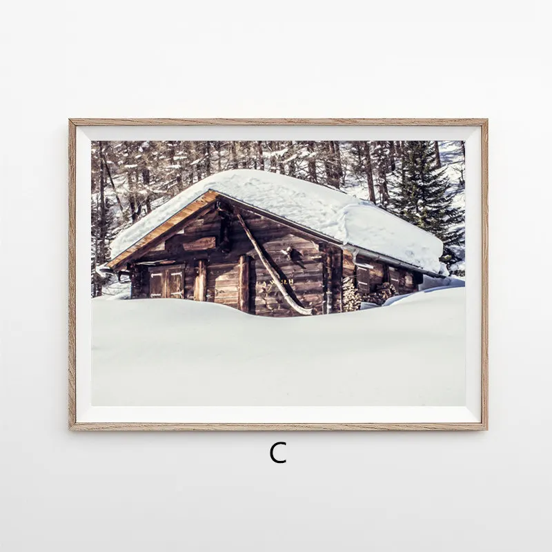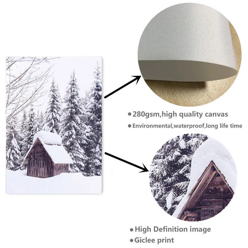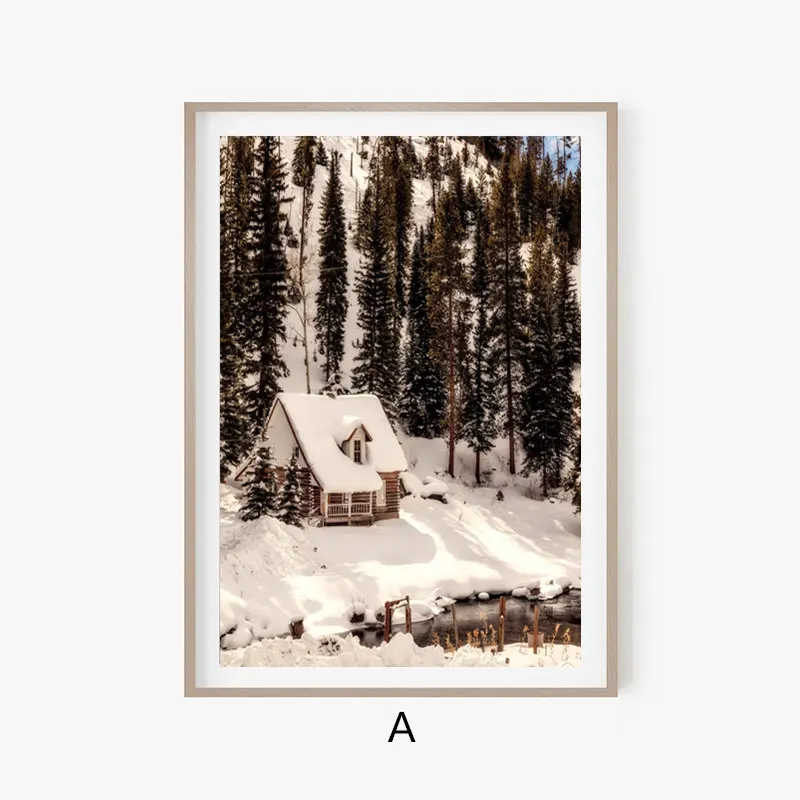 Картина на холсте зимний Снежный лес пейзаж настенное искусство скандинавский деревянный дом плакат картина домашний декор Рождественское украшение комнаты