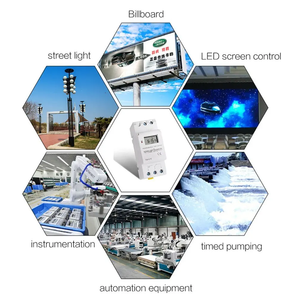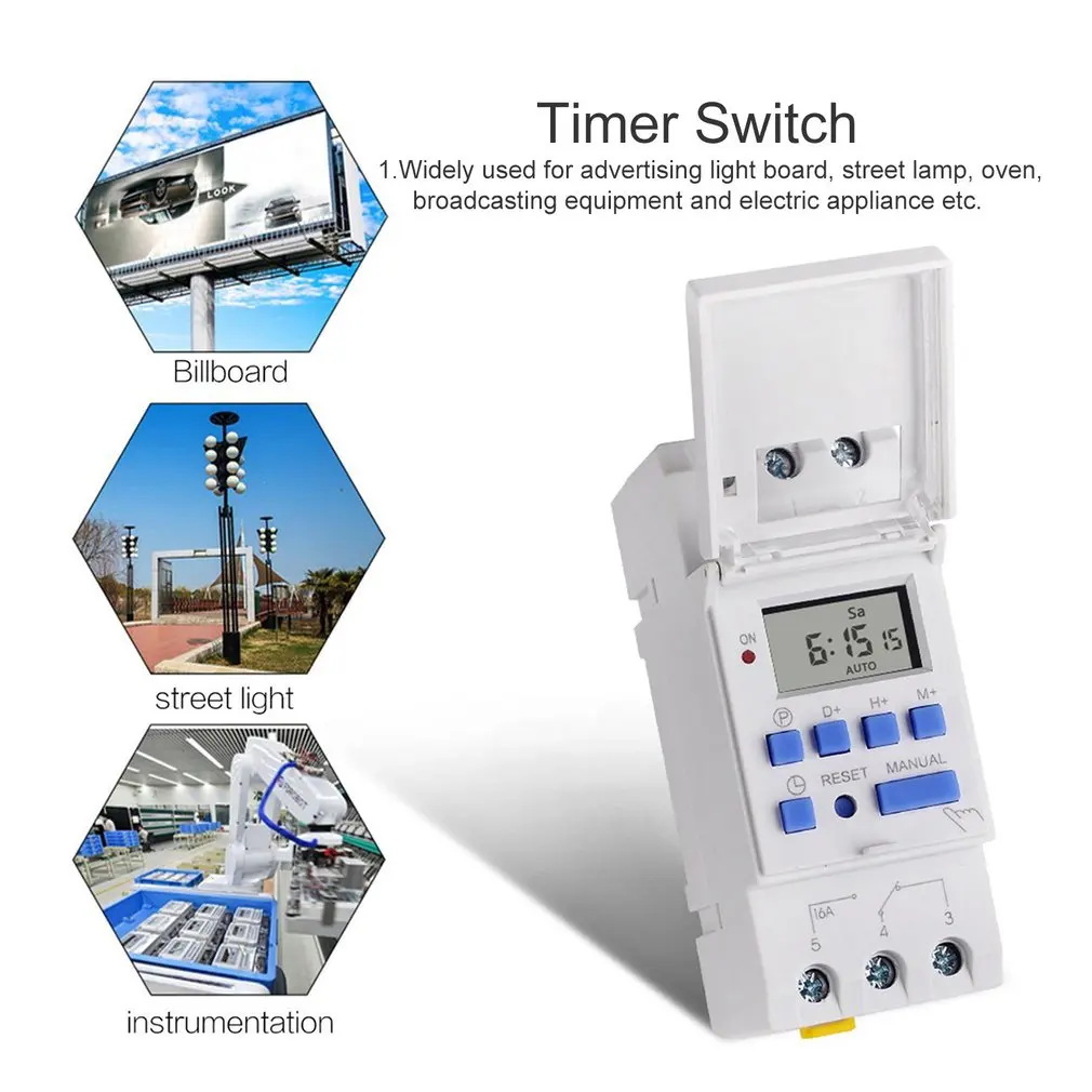 Features:1.According to your setting time,auto turn on/off the electric appliance.2.Built-in rechargeable battery for backup the memory when power failure .3.Timer setting range: 1min~168h,satisfy your need.4.Repeat programs with 17 on/off settings, and setting on/off manually5.7 days programmable.Description:1.High accuracy, light weight design.2.Widely used for advertising light board, street lamp, oven, broadcasting equipment and electric appliance etc.Specification:Brand:SINOTIMERModel:TM615-2Color:whiteWorking voltage: 220V ACPower consumption: 1.5 WDisplay: LCDPrograms:17 on/off each day or weekHysteresis: 1 sec/dayBlack-out memory: 60 daysTimer setting range: 1min~168hRecharge battery: 1.2V/40mA battery(built-in)Mounting: 35mm din railPackage Information:Package Size: 153x 95 x 45mm/6.02 x 3.74 x 1.77inPackage Weight: 133g/4.69ozGeneral Box PackagePackage Included:1 x Timer Switch1 x User Manual