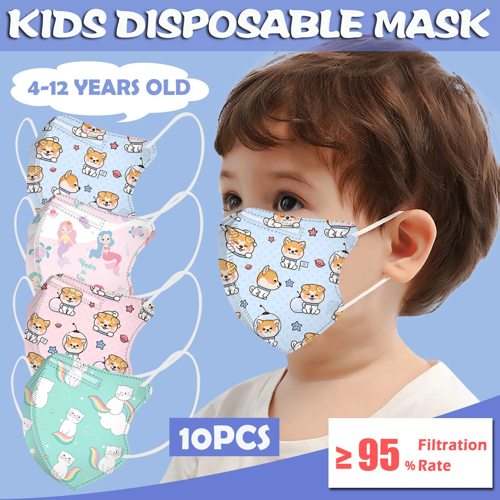 Маски детские одноразовые с мультяшным принтом, 4 слоя, 10-50 шт.