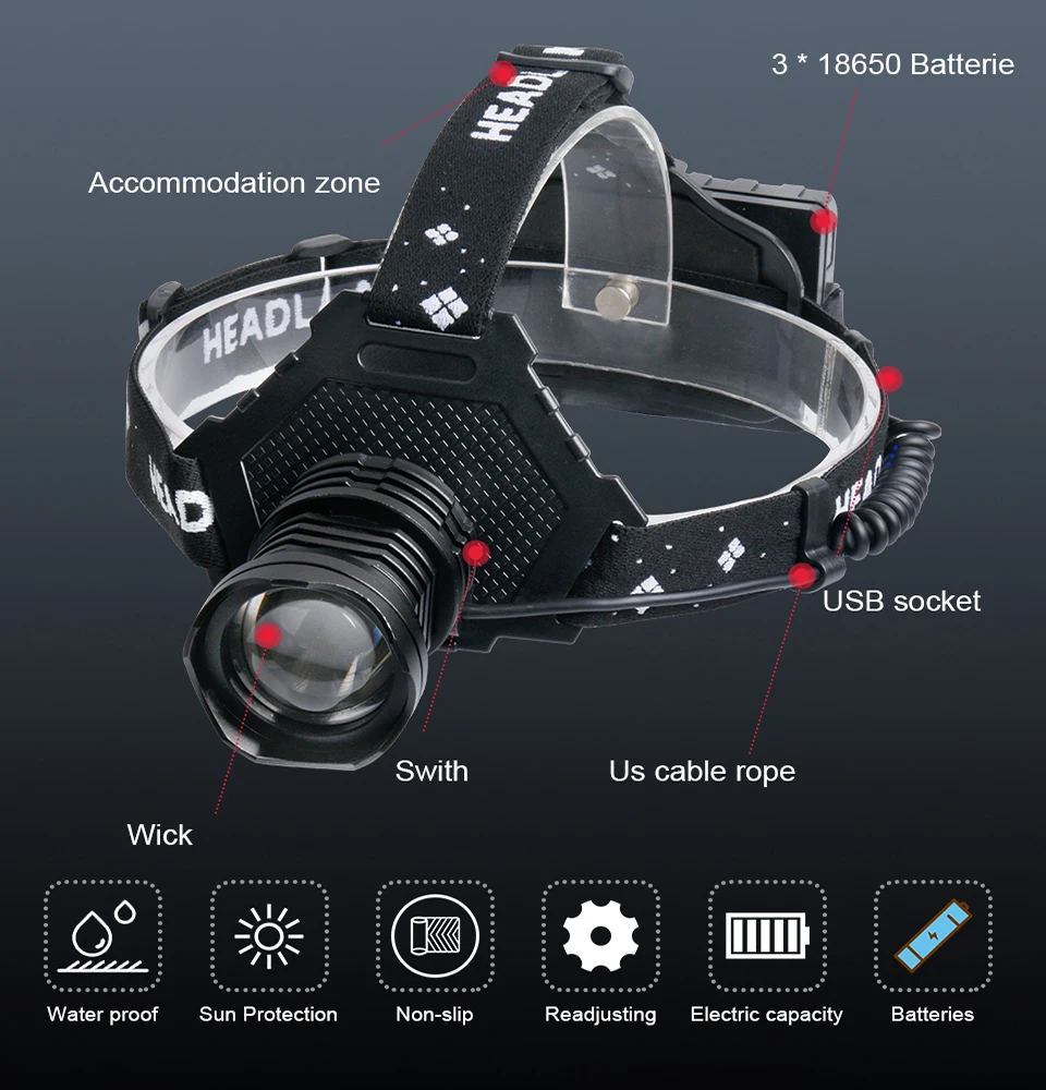 Батарея отсек: 2 режима (красный светильник-красный светильник свет, мигающий свет)• Срок службы: 100000 часов• Излучаемый Цвет: белый светильник• Батарея: перезаряжаемая батарея 3*18650 (работает только один аккумулятор 18650 или два аккумулятора 18650)