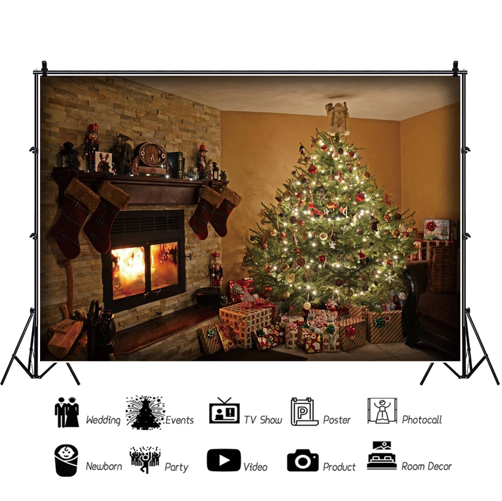 Рождественские фоны для фото дерево камин с венком подарок деревянн...
