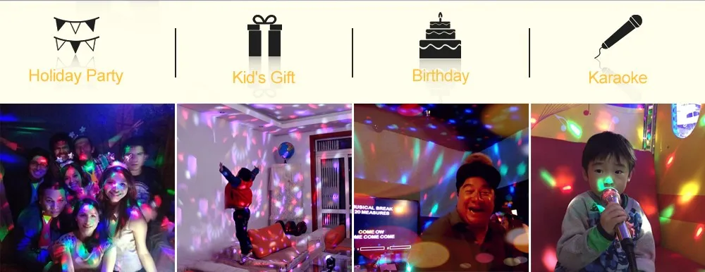 1. 3 режима активации звука: светильник ВКЛ./ВЫКЛ., фантастические стробоскопические эффекты, вращающийся дискотечный светильник s, регулируемый светильник с скоростью движения, удовлетворяет ваши потребности в любых вечеринках.2. 7 цветов режимов освещения: легко выбрать однотонные цвета (красный, зеленый, синий) или разноцветные, или все цвета вместе) с пультом дистанционного управления.3. Дистанционное управление: простое переключение вечерние светильник s с разных режимов и цветов с помощью пульта ДУ, изменение режима светильник и скорости двигателя, выключение светильник на дальнем расстоянии.4. Простота в использовании: легкий и портативный, может быть легко установлен на стене или потолке через кронштейн. Или непосредственно поместите вечерние светильник на стол или на пол.5. Идеальный вечерние аксессуары: диско освещение для День Рождения вечерние, вечерние, дискотеки, вечерние, для вечеринки с танцами вечерние, дети, День Рождения вечерние, Хэллоуин, вечерние, Рождество, вечерние, и праздник, на свадьбу, Рождество, караоке, DJ, хэллоуин, соберитесь вместе