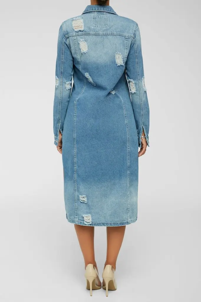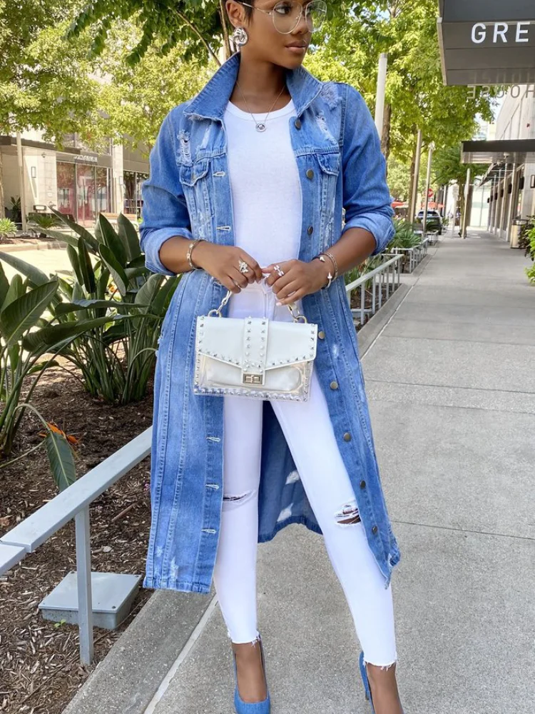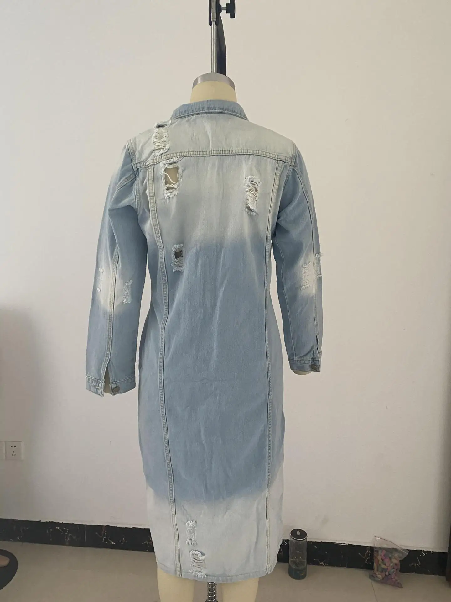 Женская длинная джинсовая куртка, рваная верхняя одежда с отложным воротником и длинными рукавами, Модная Джинсовая куртка с дырками для весны и осени