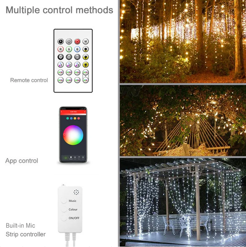 WiFi беспроводное умное приложение управления:С Bluetooth подключение Wi-Fi, светодиодный гирлянды для комнаты может быть управления Светодиодный своим смартфоном на приложение Tuya. Доступны различные режимы для выбора различных сцен. И вы можете включить/выключить освещение комнаты в определенное время с функцией расписания. Он также поставляется с 24key пульт дистанционного управления, инфракрасное излучение, 3-кнопочный смарт-контроллер коробки, позволяют управлять вашей Рождественские огни в любом месте и в любое время.