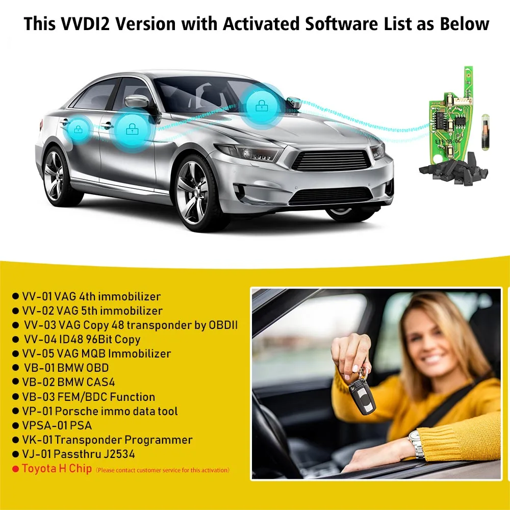 1) VV-01 для VAG 4th иммобилайзера 2) VV-02 для VAG 5-го иммобилайзера 3) VV-03 для VAG Copy 48 транспондера OBDII 4) VV-04 ID48 96Bit копия 5) VV-05 для VAG MQB иммобилайзера 6) VB-01 для BMW OBD 7) VB-02 для BMW CAS4 8) VB-03 функции FEM/BDC 9) VP-01 для Porsche immo data tool 10) VPSA-01 для PSA 11) VK-01 транспондер 12) VJ-01 для прохода J2534 13) чип для Toyota H