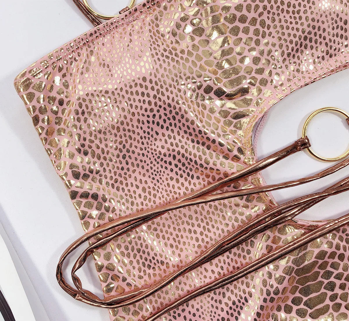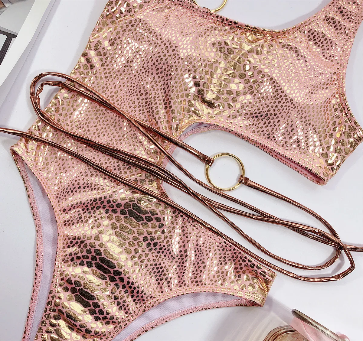 Женское сексуальное бикини из змеиной кожи с горячим тиснением, Цельный купальник с металлическим кольцом, купальник на одно плечо, Бандажное пляжное бикини