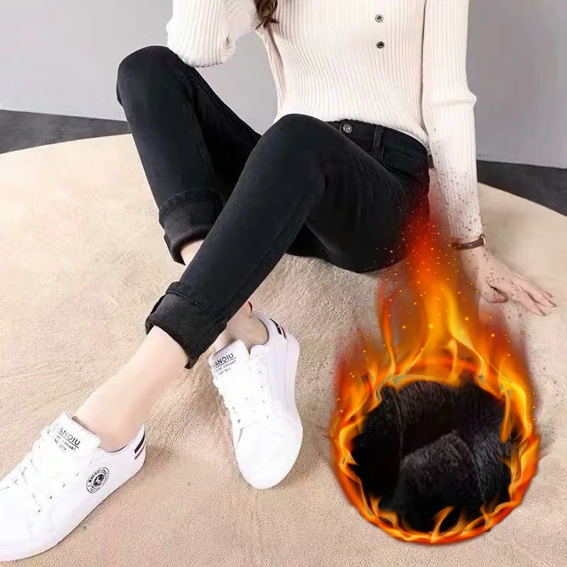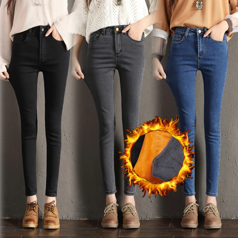 Зимние флисовые джинсы женские узкие простые бархатные теплые плотные эластичные женские повседневные джинсовые брюки-карандаш размера плюс 38 40