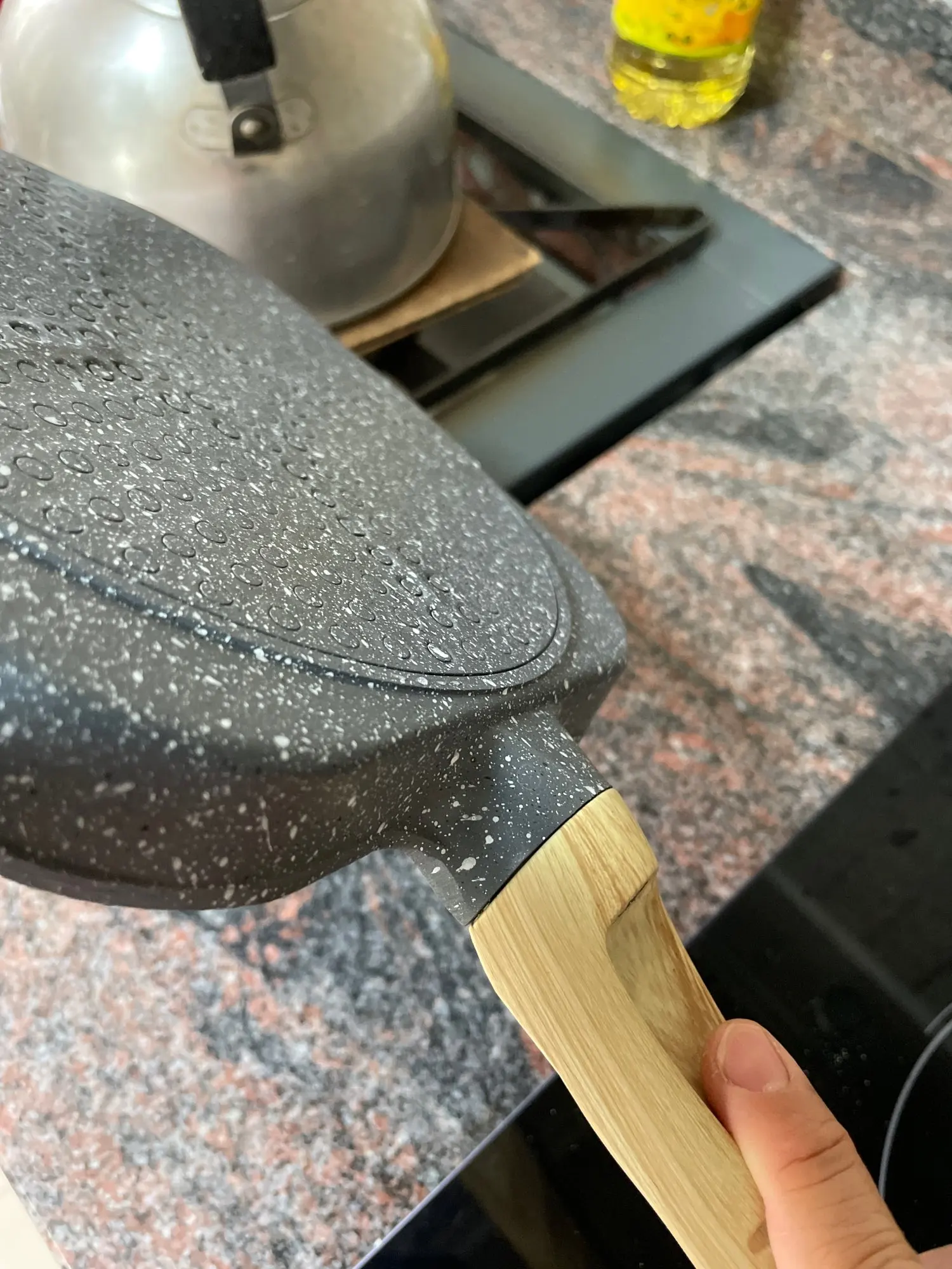 сковорода выглядит очень компактно, но ощущается вес, ручка приятная на ощупь. пришла за 2 недели. сегодня пожарила детям панкейки - ничего не прилипло, после использования легко помылась.