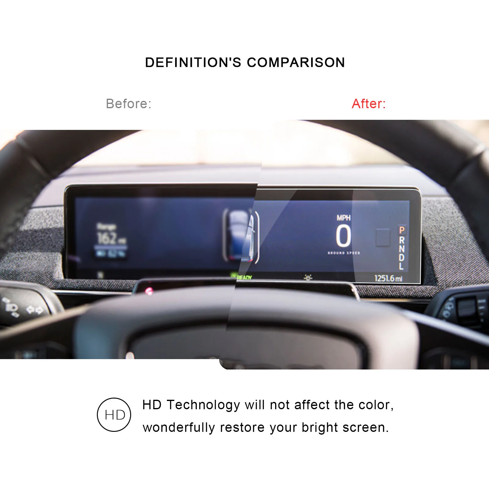 Подходит для: 2021 + Mustang Mach-E 10,2 дюймовый экран приборной панели (размер изделия: 264*72 мм)1.【Super Sharpness】:99% Прозрачность дает вам четкий hd-дисплей с гладкой поверхностью для реального касания.