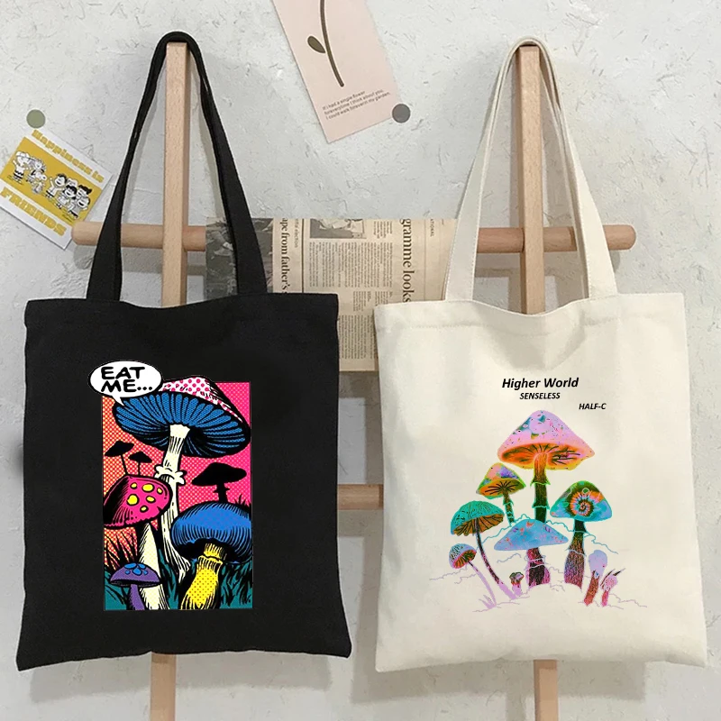 Сумка Y2k, черная, винтажная, с рисунком в виде разноцветных грибов, женская сумка-шоппер Ulzzang готика, Харадзюку, Холщовая Сумка большой емкости