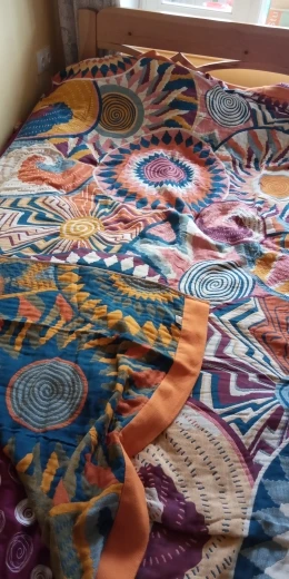 Покрывало очень качественное,мягкое ,хлопковое по ощущениям. Цвет немного бледнее,чем на картинке,но это даже интереснее. Сшито очень качественно. Спасибо продавцу.