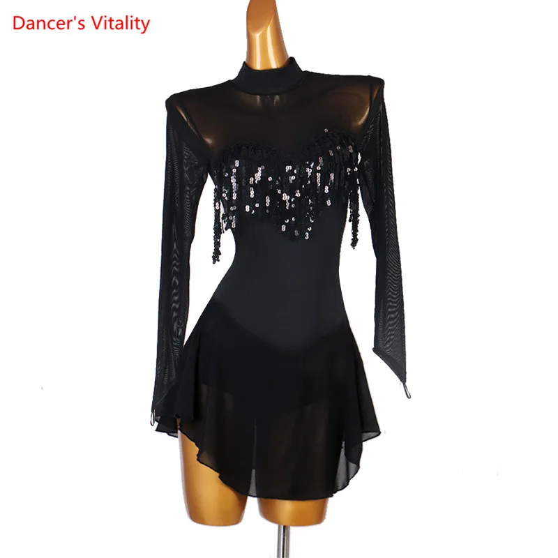 Платье для латинских танцев; Фатиновая юбка с блестками; Одежда с длинными рукавами для тренировок; Высококачественная одежда для девочек и взрослых; Одежда для выступлений