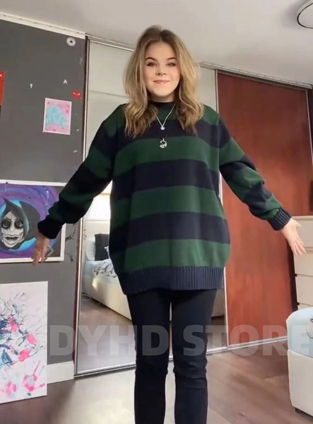 Винтажный вязаный свитер для мужчин и женщин, Повседневный хлопковый пуловер в стиле Харадзюку, свитер с надписью Tate Langdon, стильные зеленые полосатые топы, осень 2021