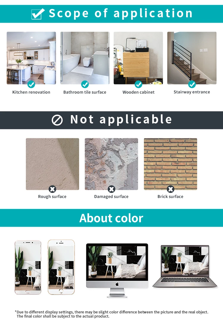 Он хорошо прилипает и отслаивается, но он не подходит для того, что я хочу, он очень тонкий и прозрачный, так что, если вы положите его поверх суставов или плитки с некоторыми рисунками, вы увидите. Они посылают его хорошо защищенным. Они должны сказать, что это работает только для гладких и белых поверхностей.