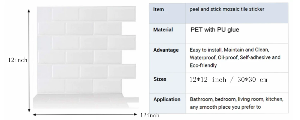 Описание продукцииОн имеет 3D эффект и ощущение блестящей стеклянной плитки.Используя алюминиевую фольгу, этот продукт прочнее, чем обычный лист ПВХ.Его можно наносить на изогнутую поверхность и угловую поверхность.И вы можете отрезать его ножницами или резцом для предпочтительной формы, чтобы вы могли использовать его не только стену.Простая и гибкая установкаЛегкая конструкция: может быть нанесена на изогнутую поверхность и угловую поверхность. И вы можете отрезать его ножницами или резцом для предпочтительной формы, чтобы вы могли использовать его не только стену.Никаких специальных инструментов не требуется.Это стикер продукта, так что вы можете прикрепить и отсоединить несколько раз.Различные типы* Имеет 3d-эффект и ощущение блестящей стеклянной плитки.* Просто очистите его влажным полотенцем, если он станет грязным.Обработка алюминиевой фольги* Используя алюминиевую фольгу, этот продукт прочнее, чем обычный ПВХ лист* Без вредных компонентов: без фталатов, без диоксинов, без кадмия, без ртути.