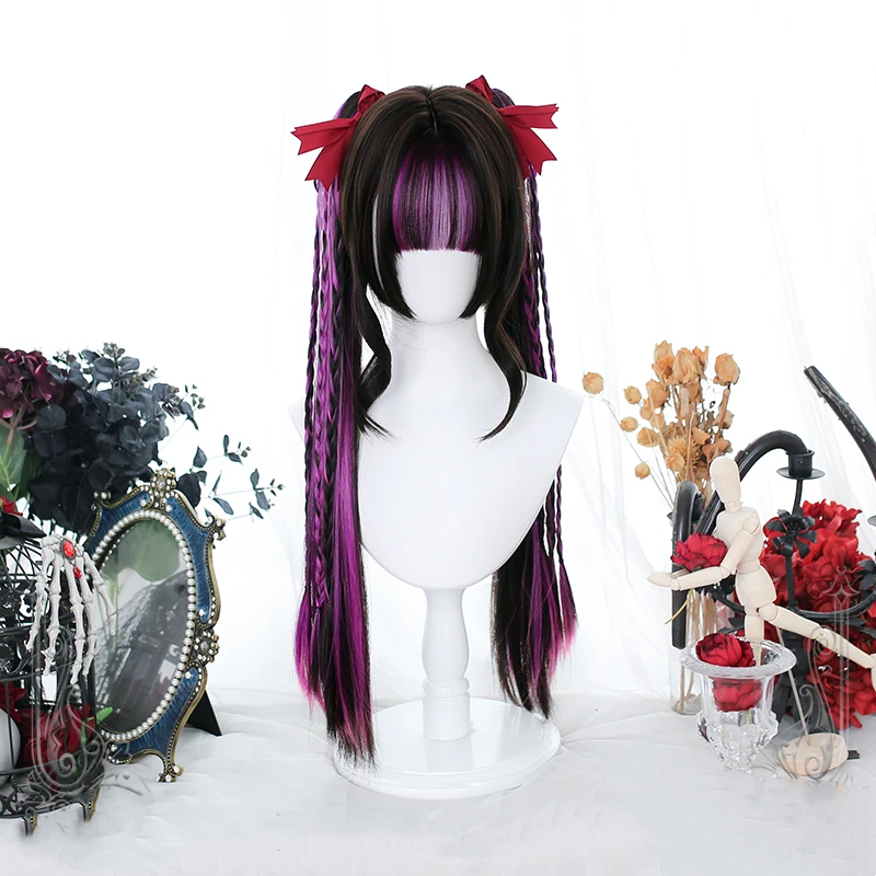 Парик Харадзюку длинный прямой, смешанный, розовый, фиолетовый, для косплея, с хвостиками, с темно-коричневыми челками, сказочная принцесса для девушек, аксессуары