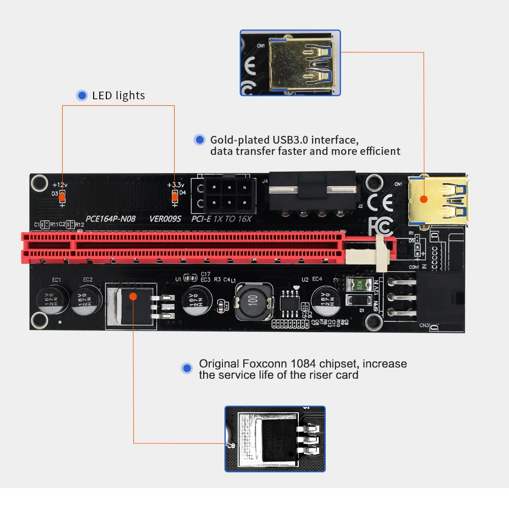 Райзера хорошие. Упакованы по 10 шт в коробочку. Из минусов - 5 очень ярких синих диода. Если риг открытый и на балконе - все соседи будут знать :-(