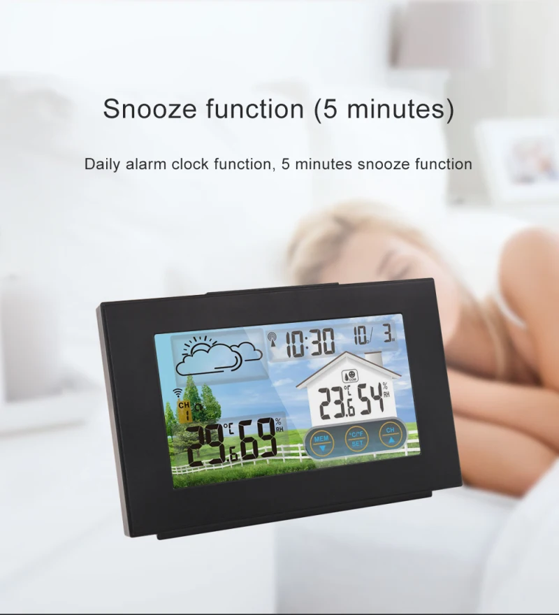 4. Внутренняя/наружная температура и влажность (°C или °F). Диапазон измерения температуры в помещении: -10 ℃ ~ 50 ℃, Диапазон измерения температуры на открытом воздухе: -40 ℃ ~ 70 ℃, диапазон измерения влажности в помещении и на открытом воздухе: 20% RH ~ 95% RH.