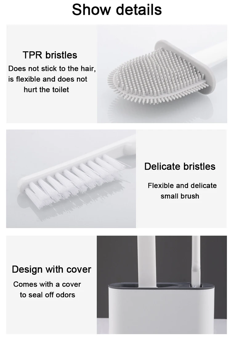 TPR набор кистей и держателей для унитаза, силиконовая щетиная щетка для унитаза, настенный пол, ванная комната, чистящий инструментОсобенности продукта: продукт1.TPR материал щетины: скрабы и удаляет пятна на поверхности одежды легко с маленькими царапинами; Меньше вероятность износа, прочный и прочный.2. Моющаяся головка щетки: не пачкается, головка щетки быстро стирается после чистки туалета, нет места для пятен, чтобы скрыть3. Не проливается: высококачественное PP утолщенное Основание не будет легко наклоняться или рухнуть, держите свой протравленный и красивый.