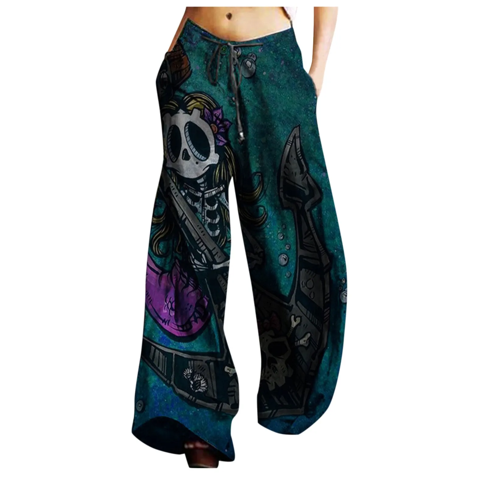 Штаны оверсайз женские, с принтом черепа, кота, цветов, широкие штаны с карманами