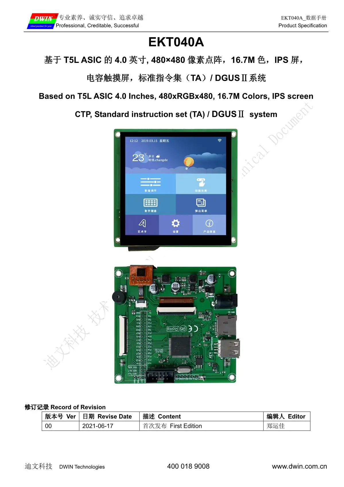 DWIN EKT040A 10,1-дюймовая оценочная плата, основанная на T5L ASIC 480xRGBx480, 4,0 м цветах, IPS экран CTP, T5L0 UART1