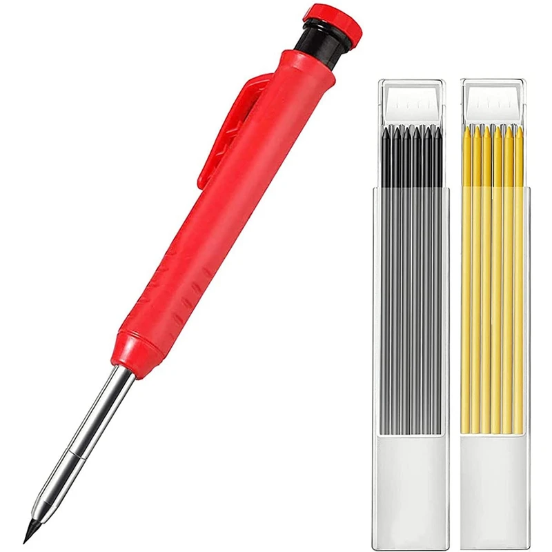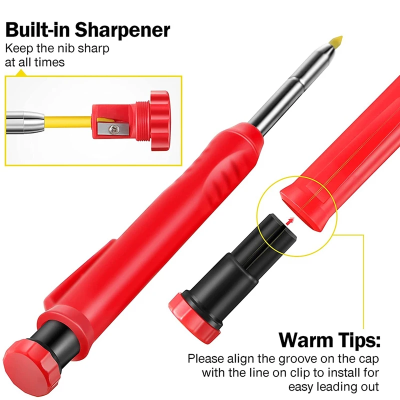 Дизайн с глубоким отверстием: карандаш для плотника с глубоким отверстием разработан с удлиненным и игольчатым наконечником 45 мм в длину, достигая труднодоступных мест, где другие маркер плотника не идут, идеально подходит для маркировки через отверстия или в других плотных областяхТочные отметки точилкой: точилка для карандашей вкручивается в верхнюю часть механических карандашей для рисования, которые не потеряются и ваш механический карандаш всегда будет заточен для хорошей точности, это поможет вам закончить работу более эффективноПрочные столярные карандаши: карандаш для черчения долговечен, который смазывает, чтобы отслеживать везде и прочнее, чем жесткий свинец, и карандаш не выскальзывает из Пальцы и повторяющиеся следы вызывают меньше боли; С удобным карманом, легко носить и использовать, не легко терять, можно применять в течение длительного времениПодходит для различных поверхностей: карандаш для плотника можно нарисовать на металлических, пластиковых, стеклянных, деревянных, бумажных и т. Д.; Желтый цвет можно протирать на темных поверхностях, где серый свинец не рисует, подходит для строительства и кирпичной кладкиЧто вы получите: маркер для деревообработки предварительно заполнен серым свинцом, поставляется с 2 ящиками для пополнения, включая 6 серых наконечников и 6 желтых проводов, которые могут удовлетворить ваши потребности в ежедневном использовании и заменеПолностью Металлическая и многоразовая конструкция, встроенная точилка. Серые и желтые стержни для карандаша удобны для ежедневного использования, они помогут вам более эффективно закончить написание и рисункиПримечания: заостренные детали, пожалуйста, держите подальше от детей до 3 лет.Цвет: красныйМатериал: АБС-пластикПосылка:1 Набор х столярные карандашиТолько вышеуказанная посылка, другие товары не включены.Примечание: светильник и различные дисплеи могут привести к тому, что цвет товара на картинке немного отличается от реального. Допускается погрешность в измерениях +/- 1-3 см.