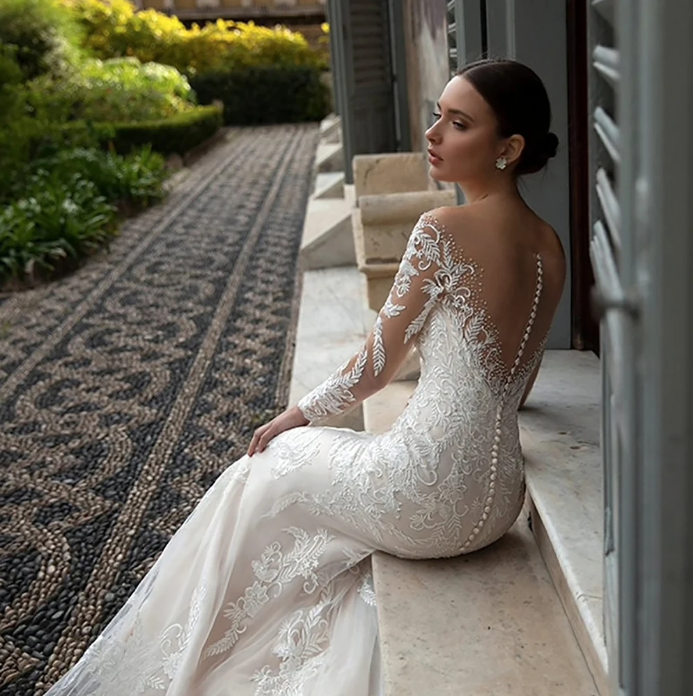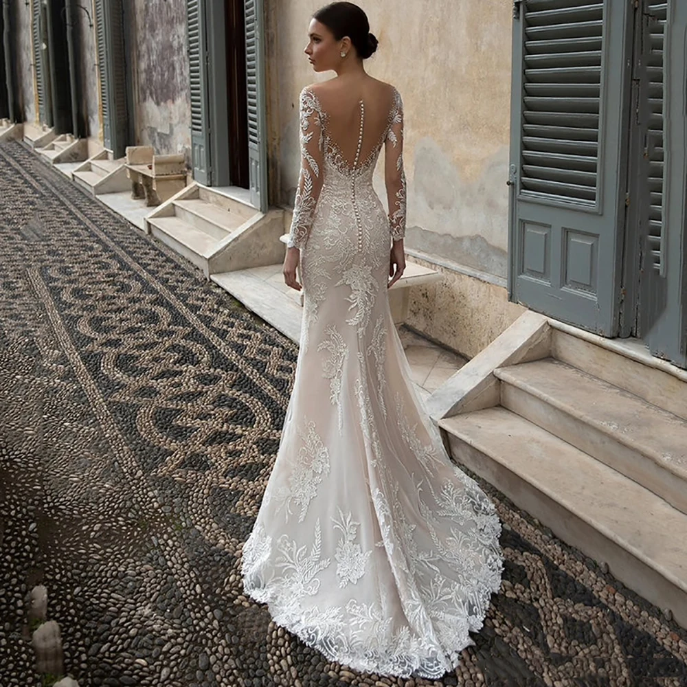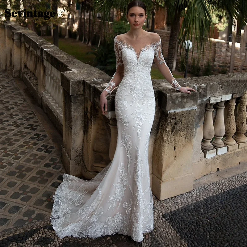 Женское свадебное платье с юбкой-годе Sevintage, кружевное платье с длинными рукавами и V-образным вырезом, с аппликацией и пуговицами, 2021