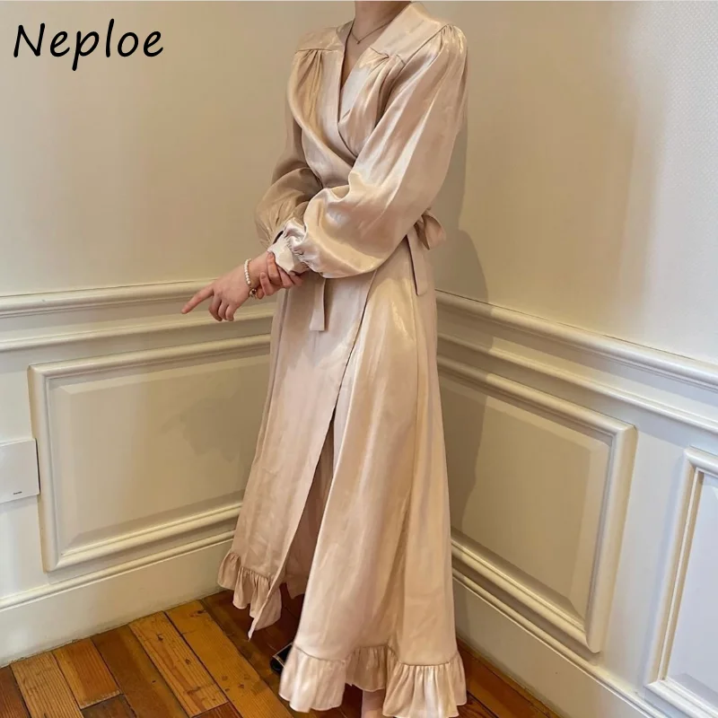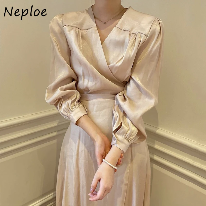 Элегантное женское однотонное платье Neploe, женское платье с V-образным вырезом и перекрестными бретельками, женское платье с высокой талией, платье-макси с пышными рукавами, платья
