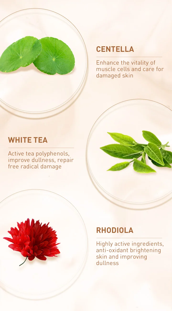 Дайте вам мощный эффект удаления шрамовСофораСпособствует росту и ремонту поврежденных кровеносных сосудов и нервных клеток. Восстанавливает жизненную силуПодкожные капиллярные клетки делают кожу упругой и гладкой снова.ЦентеллаПовышает жизненную силу мышечных клеток и уход за поврежденной кожейБелый чайПолифенолы активного чая, улучшают тусклость, восстанавливают свободные радикальные поврежденияРодиолаВысокоактивные ингредиенты, антиоксидантное Осветление кожи и улучшение тусклости