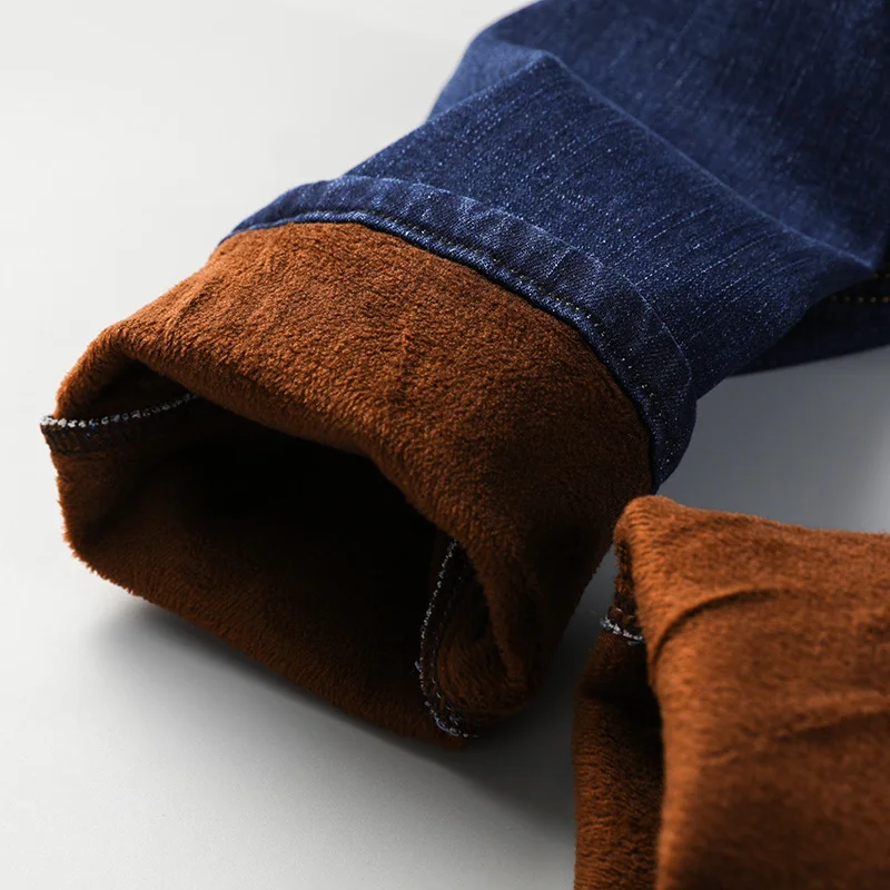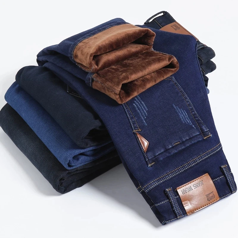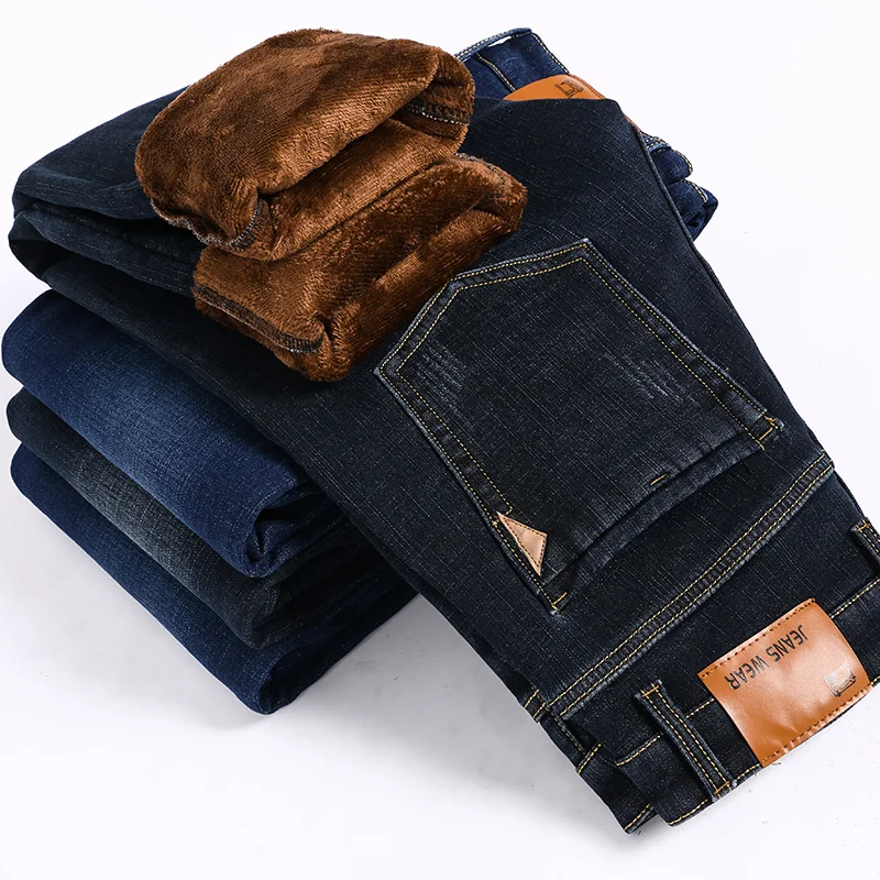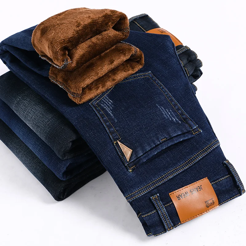 Зимние теплые джинсы для мужчин, облегающие Прямые Бархатные толстые джинсовые брюки, Стрейчевые классические повседневные мужские длинные брюки большого размера