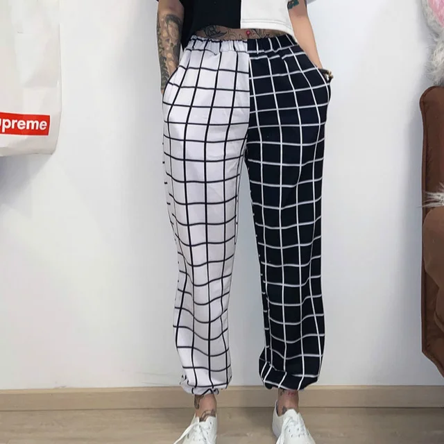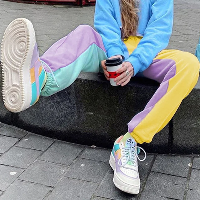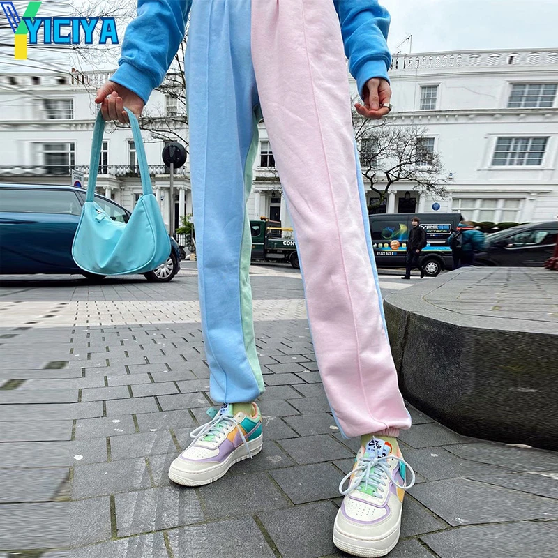 Брюки женские повседневные с завышенной талией, свободные Джоггеры в стиле пэчворк, уличная одежда в стиле хип-хоп, розовые голубые контрастные цвета