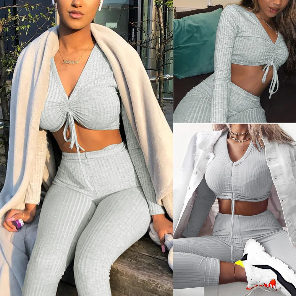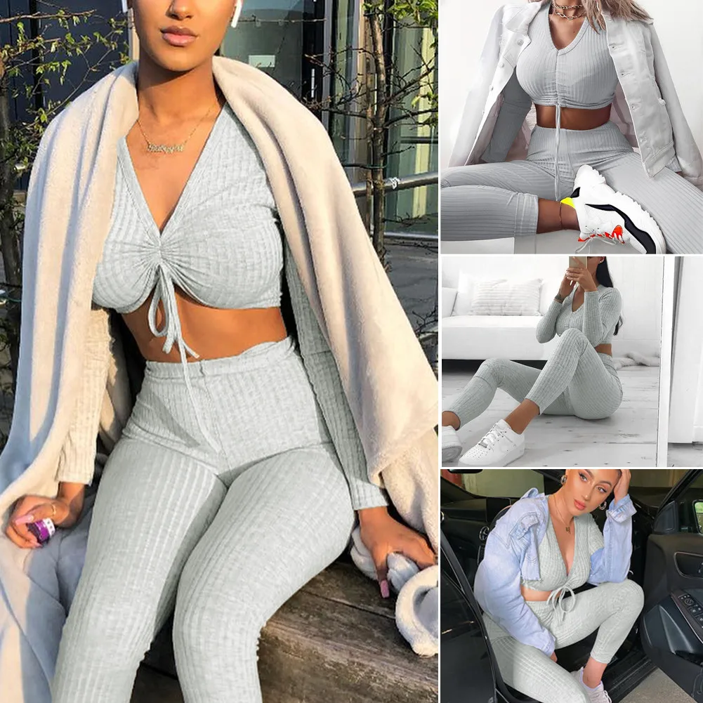 Женские Брючные костюмы, облегающие комплекты, трикотажный короткий топ и длинные брюки, Клубные костюмы, женский комплект из 2 предметов, спортивный костюм, повседневный серый