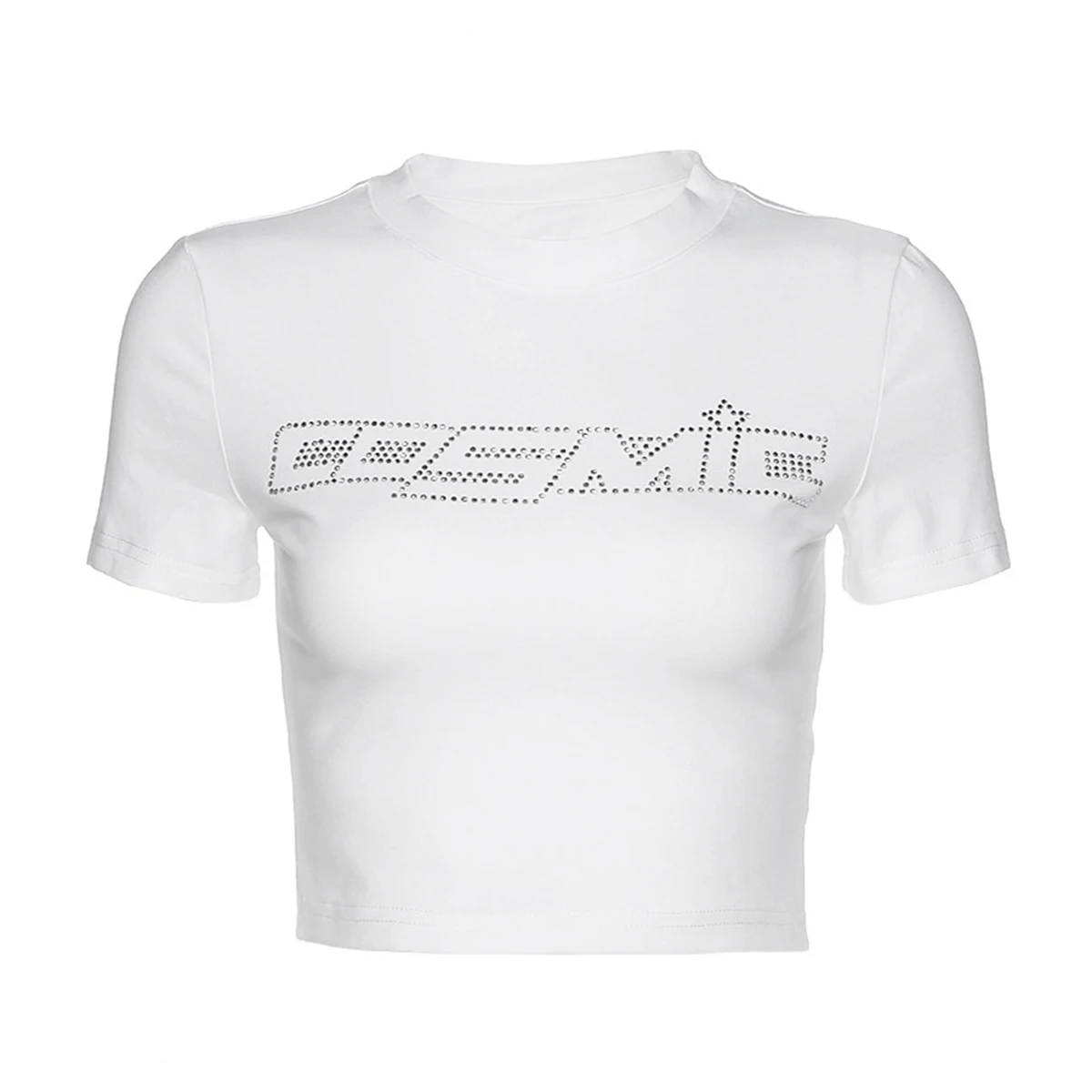 Женский короткий топ с коротким рукавом, блестящая футболка с космическими надписями, облегающий жилет до пупка, Клубная уличная одежда, лето