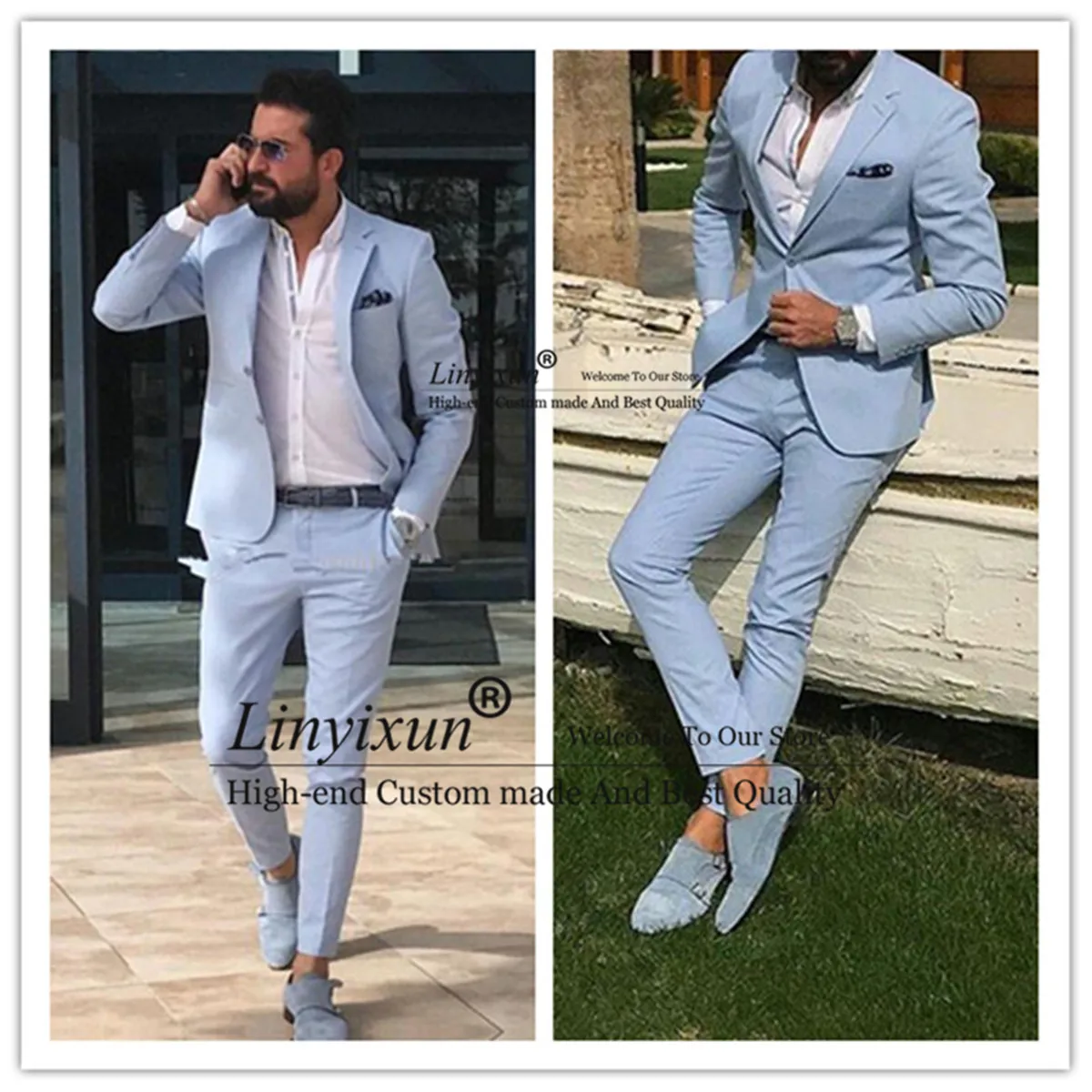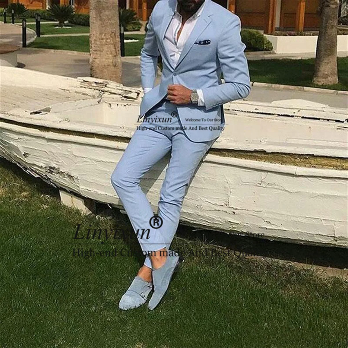 Повседневные синие мужские костюмы, тонкий пиджак и брюки, комплект из 2 предметов, Официальный деловой пиджак, Мужской пляжный свадебный смокинг для жениха