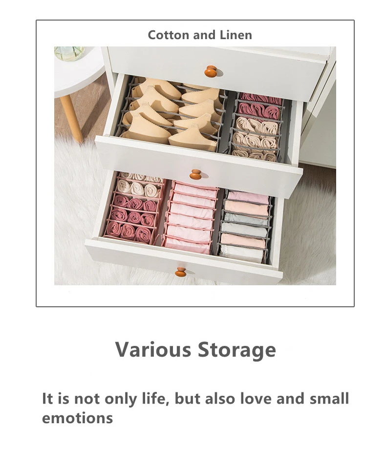 Этот набор содержит 7 или 11 различных ящиков для хранения для вас, чтобы организовать undies, шарфы, бюстгальтеры, леггинсы, носки и другие предметы, которые вы хотите.