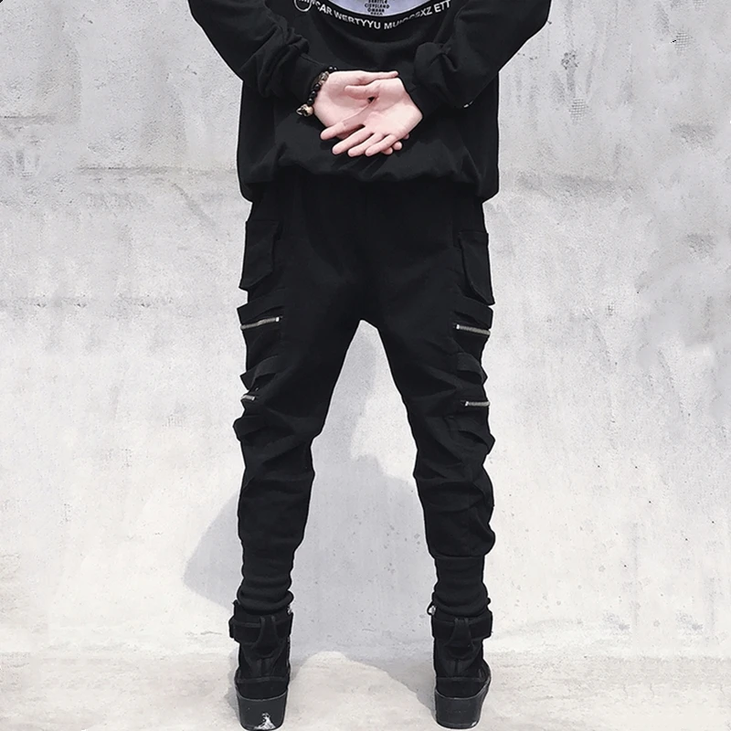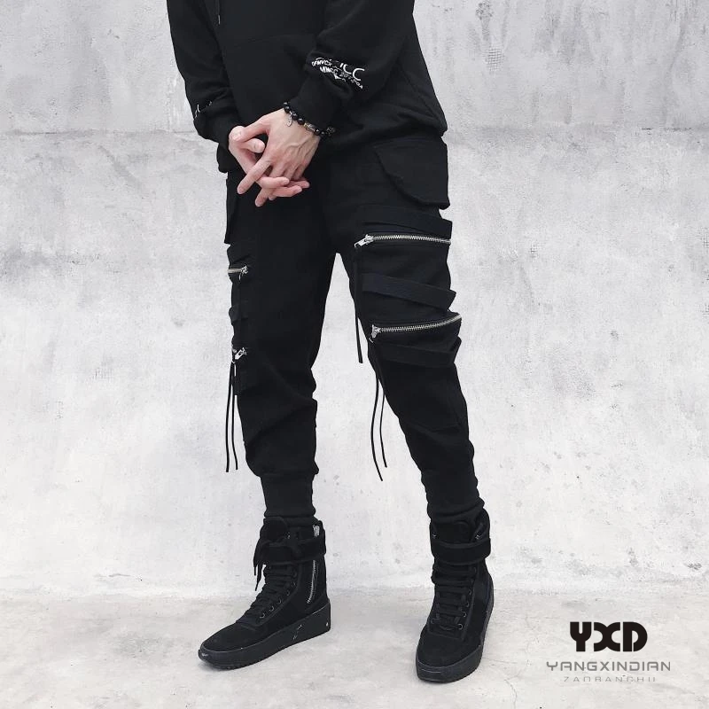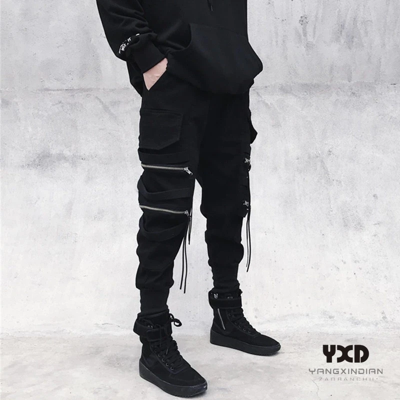 Штаны-шаровары с лентами, мужские брюки-карго, уличная одежда, осень, хип-хоп, повседневные, с карманами, на молнии, спортивные штаны, мужские, Harajuku, модные брюки
