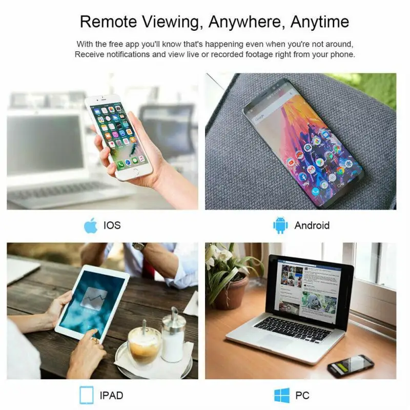 Простая установка и стабильная WI-FI соединение-легкая и быстрая установка с стабильной 2,4 ГГц WI-FI. Следуйте инструкциям в руководстве по применению. Приложение Совместимо с устройствами iOS и Android (не только для iPhone / Android / iPad, но и для ПК). Это позволяет удаленно контролировать каждый уголок вашего дома 24 часа в сутки.