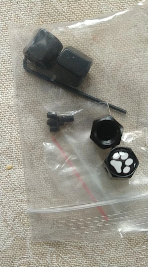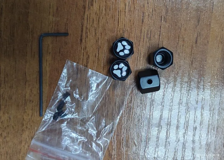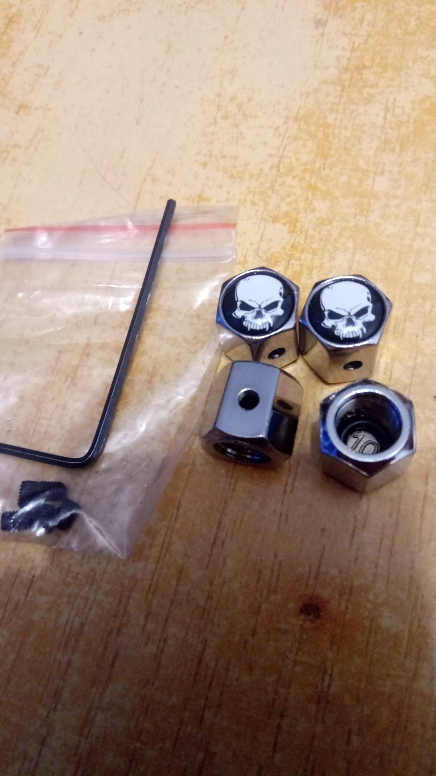 на 4 колпачка 5 болтов и 1 ключ, очень придусмотрительно! шло 2,5 недели, пришло на почту в пакете. в колпачках резиновые уплотнители. сами колпачки тяжеленькие, похоже на сталь или латунь, лишь бы не алюминь, а то опять будет прикисать.