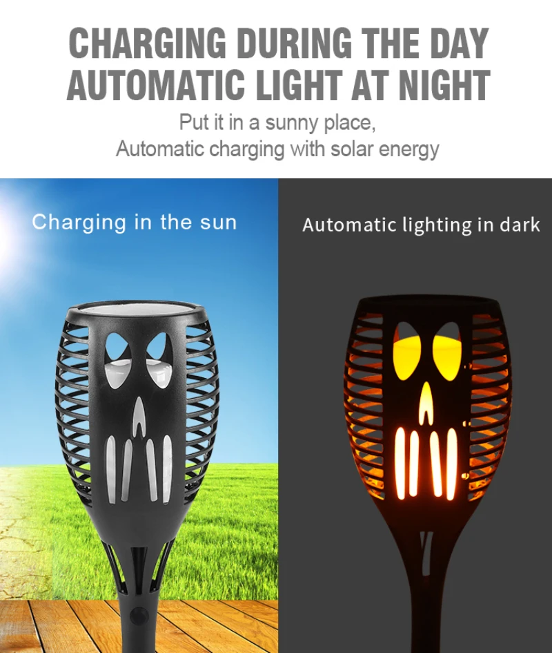-Питание от солнечной энергии: это наружное пламя солнечных факелов собирает солнечную энергию в течение всего дня под прямыми солнечными лучами, затем включается автоматически в сумерках. Светильник работает на солнечной энергии, поэтому вы можете разместить его в любом месте под прямым солнечным светильник!