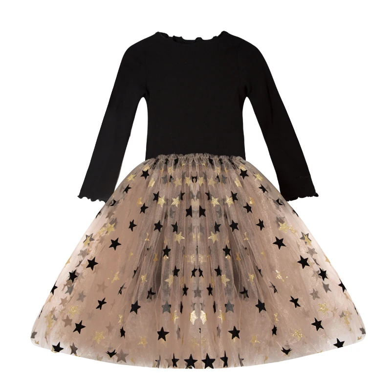Трикотажное платье принцессы для девочек, Тюлевая пачка с блестками, детская одежда для дня рождения, костюм с длинным рукавом и оборками, веснаосень