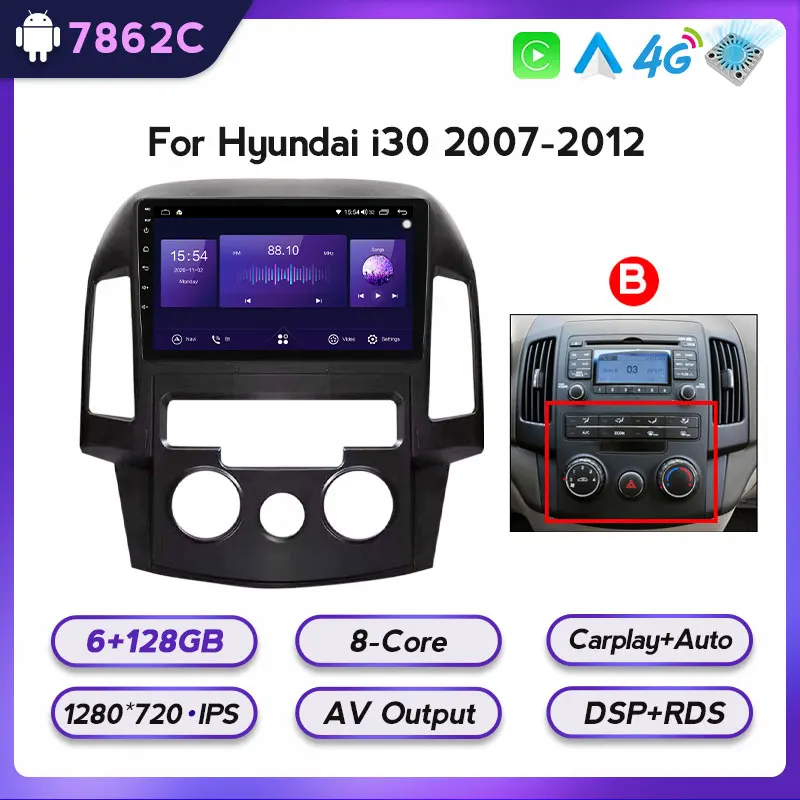 Автомобильный мультимедийный плеер, 2 DIN, с радио, 6G, 128G, вентилятором, Android 11 BT, GPS-навигацией для Hyundai I30 2006 2007 2008 - 2011