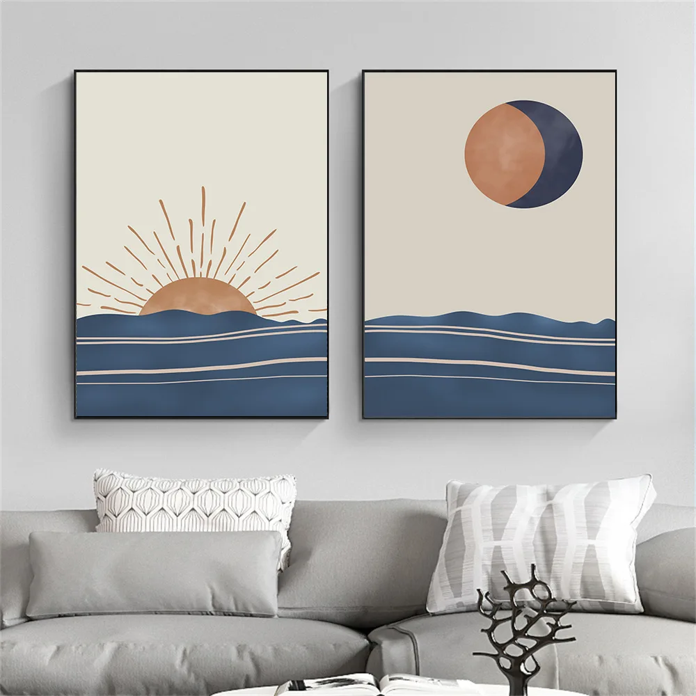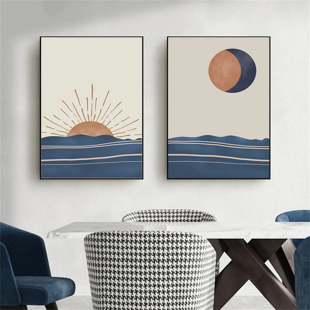 Абстрактный настенный плакат с изображением Солнца и Луны, синее море, художественный принт, рассвет, пейзаж, холст, картины в стиле бохо, современный декор для гостиной