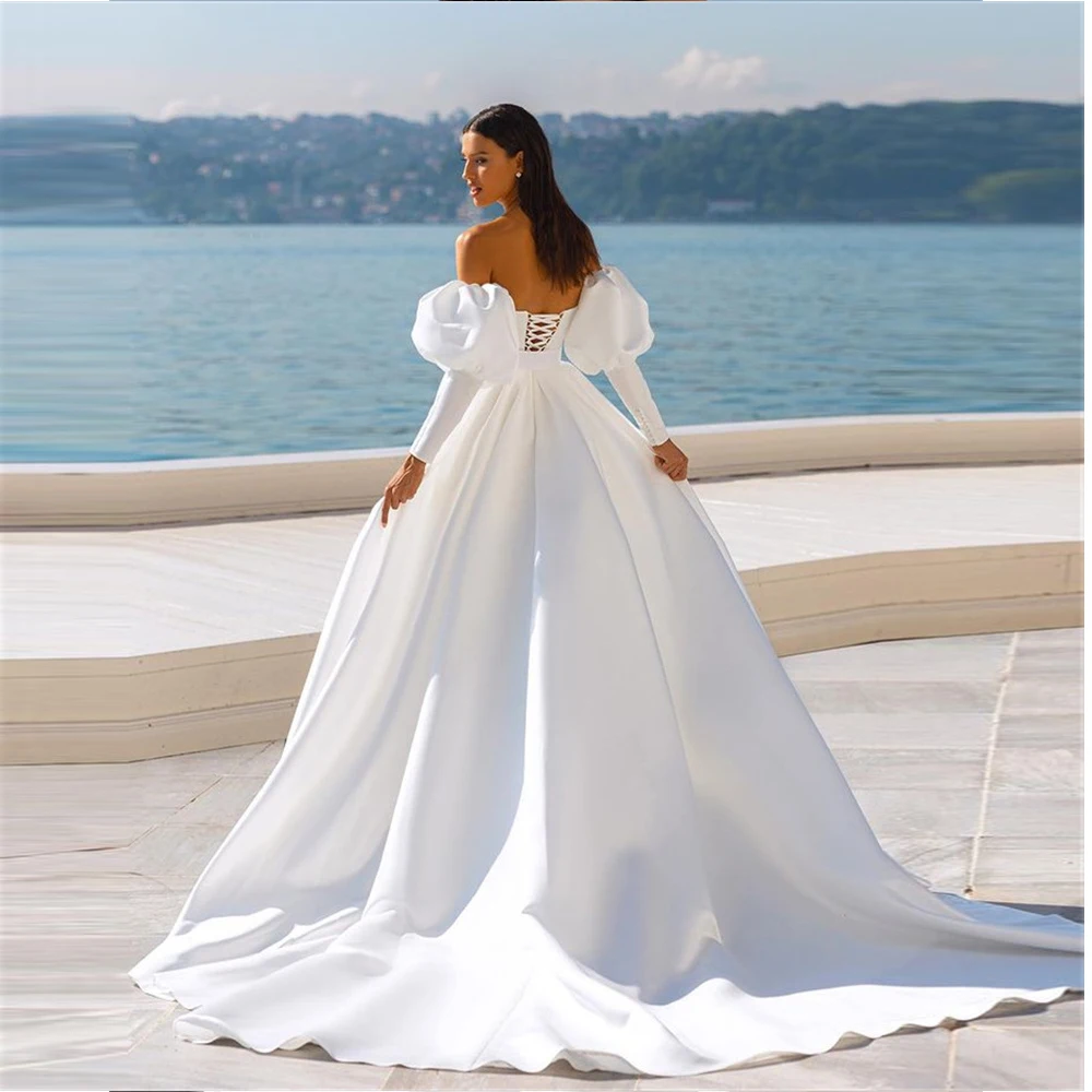 Платье свадебное атласное со съемными пышными рукавами и Боковым Ра...