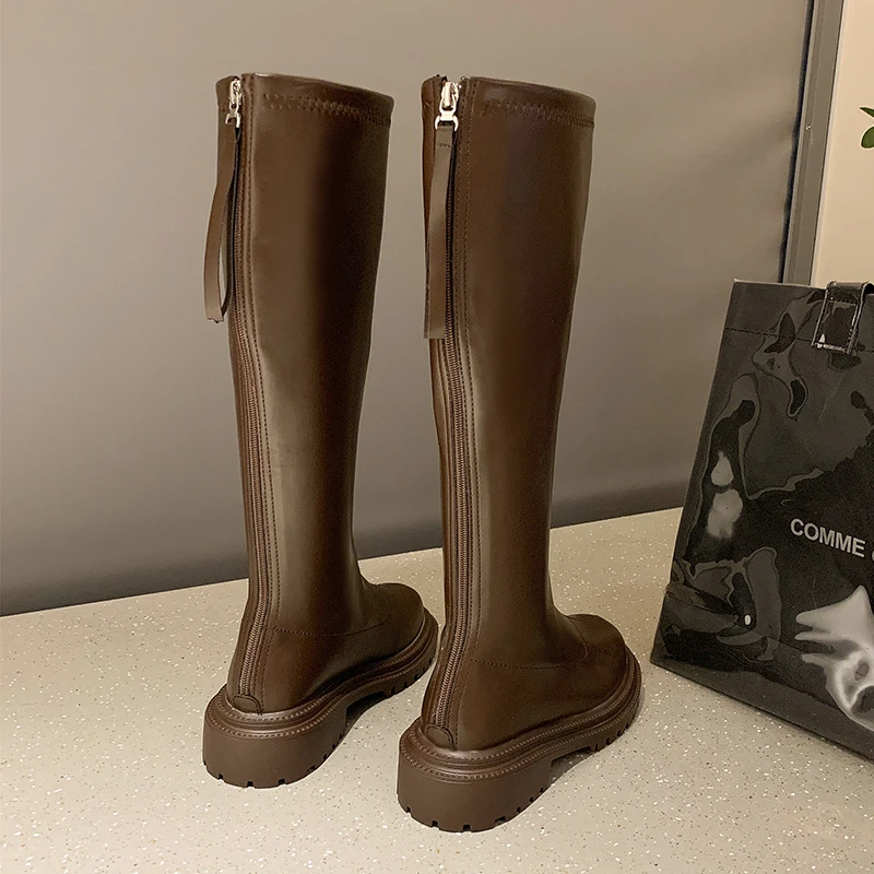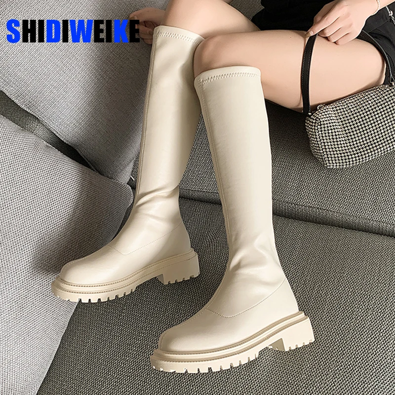 Повседневные женские сапоги до бедра на низком каблуке; Цвет бежевый, коричневый; Ковбойские сапоги из мягкой кожи на платформе; Зимние дизайнерские высокие сапоги в стиле панк