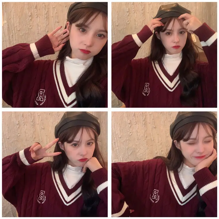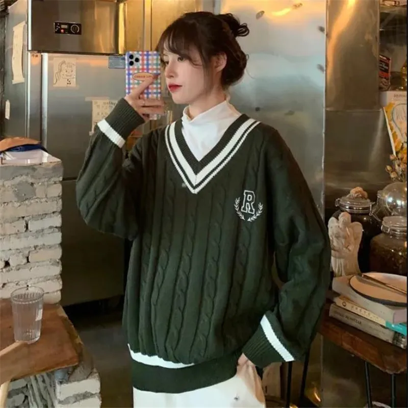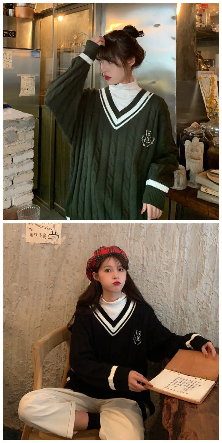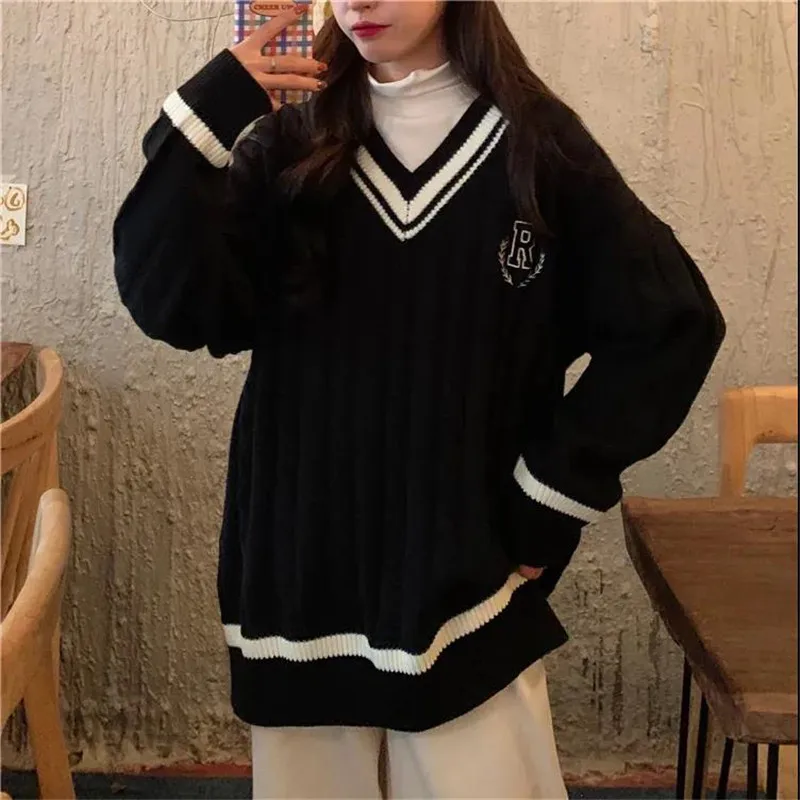 Женские свитера Ulzzang с V-образным вырезом, повседневный женский свитер в стиле оверсайз