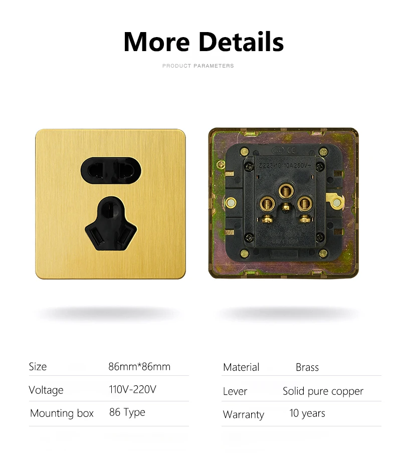 Материал: медьЦвет: ЗолотойНоминальный ток: 10A/16AНоминальное напряжение: 110-250 ВРазмер: 86*86 ммУпаковка: 1 шт.